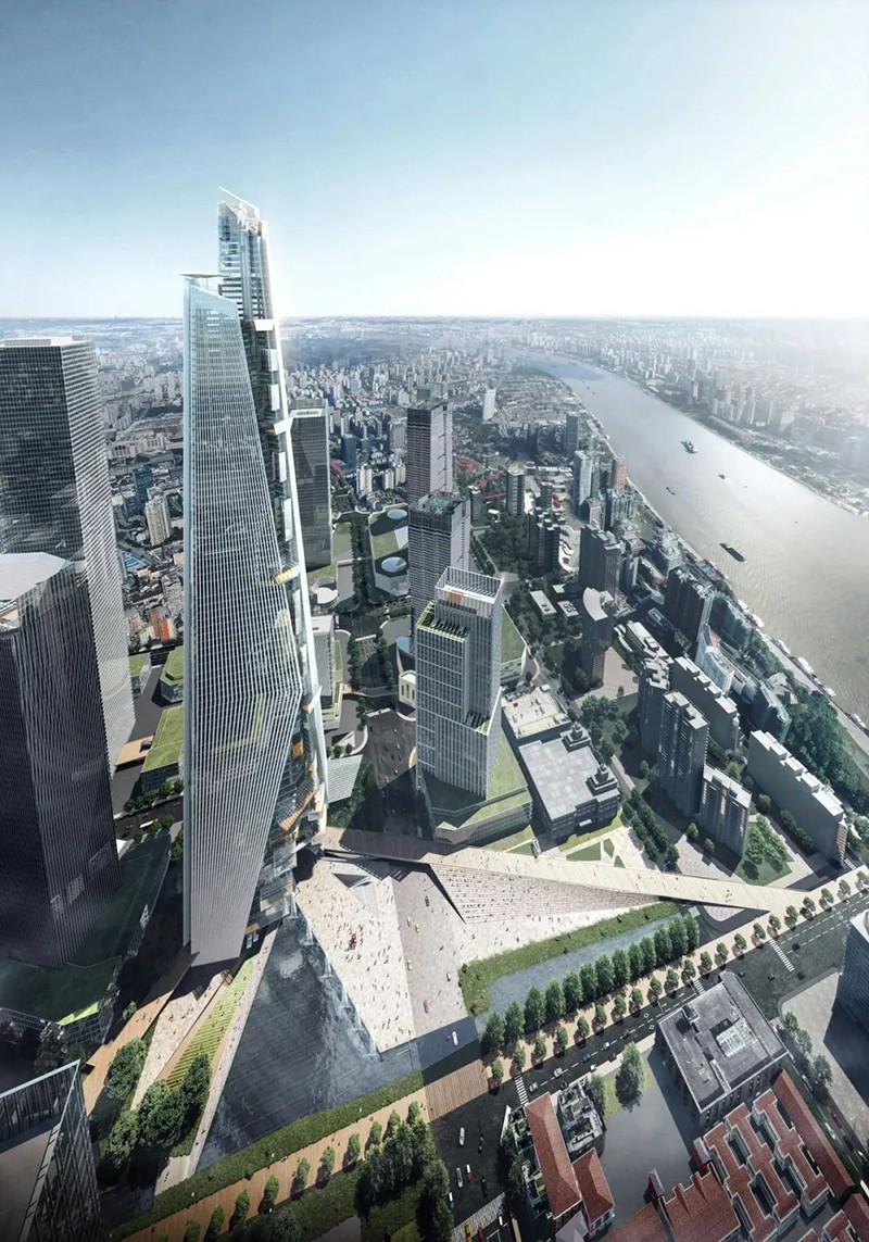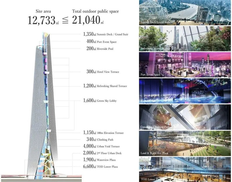上海北外灘舉辦480米超高層塔樓設計競賽,吸引了60家全球設計事務所參與。該項目包括辦公、酒店、商業和觀景臺等功能,旨在成為區域地標并打造上海市民活動中心。日建設計公司基于以往經驗,提出了一個創新設計方案,關注未來高密度城市公共空間和環境問題。