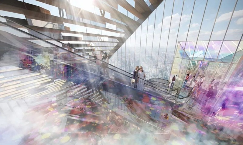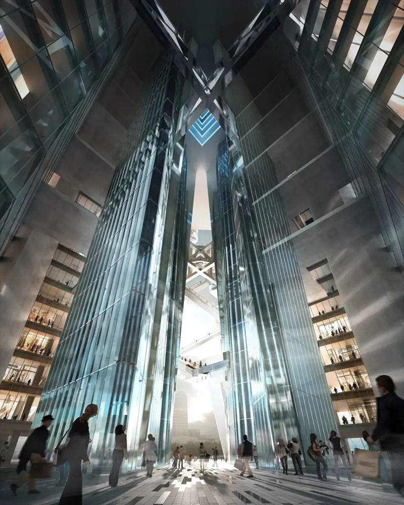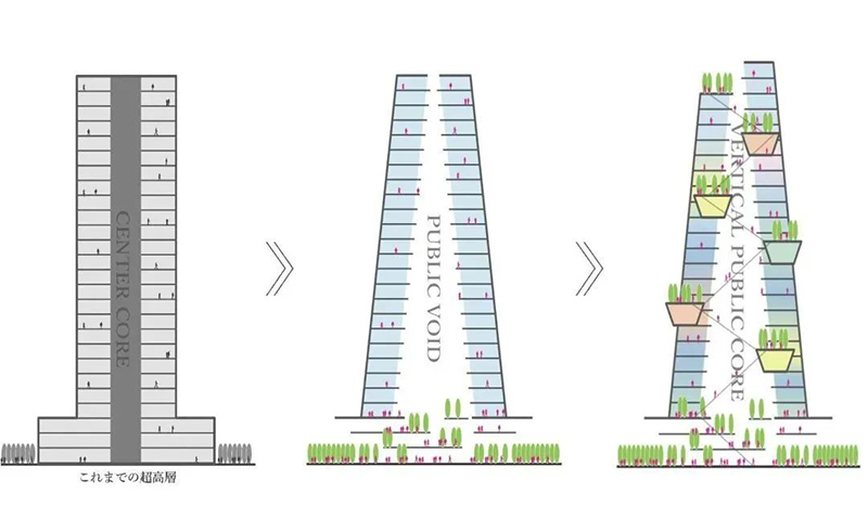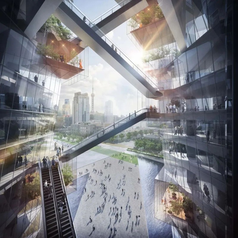 與傳統超高層建筑的封閉式設計不同,該項目在建筑中開設了一個巨大的孔洞“PUBLIC VOID”,將外部環境引入高層區域。通過這一設計,新增的外部公共空間面積達到2.1萬㎡,是用地面積的1.7倍,從物理層面擴展了城市公共空間。設計還通過自動扶梯連接PUBLIC VOID內的公共空間,實現立體移動,提升空間流動性和體驗感。