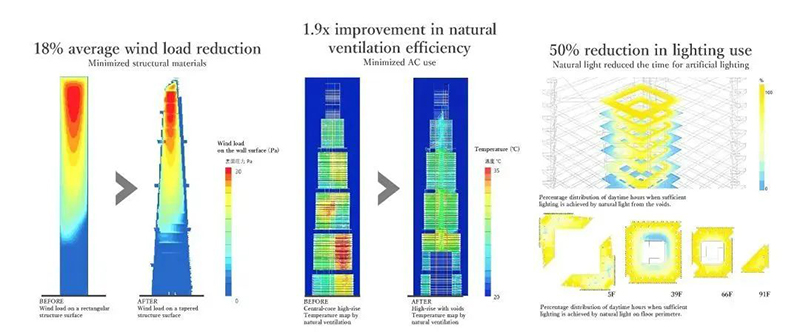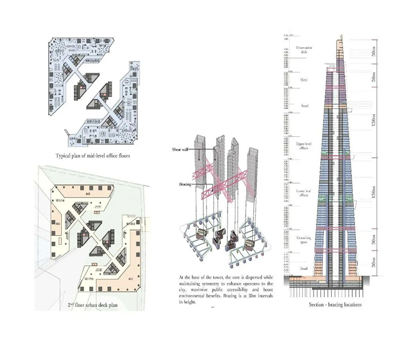 該建筑在50年內預計減少71萬噸CO2排放,相當于種植1620公頃森林。結構設計采用簡單的雙軸對稱平面,兩棟L形建筑在每隔50米或150米處連接。這個獨特的設計方案為超高層建筑帶來了新的公共空間形態,成為上海未來城市發展的重要示范。