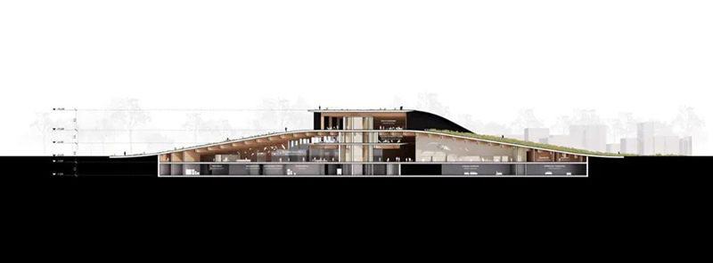 博物館的設計靈感源自三條相互交疊的景觀帶,這些帶狀結構從森林地面升起,形成一個與自然環境和諧融合的建筑形態。建筑采用大規模木結構,并以燒焦的木材作為外立面,使其部分嵌入地下,與周圍公園環境無縫銜接。傾斜的屋頂提供了廣闊的城市景觀。