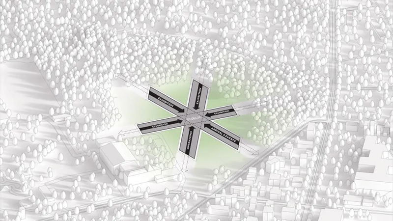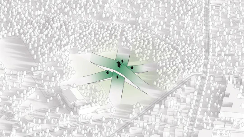 博物館從四面八方均可進入,南側廣場作為主要入口,既是社區活動的聚集地,也是博物館活動的中心點。蜿蜒的森林小徑和開放的廣場設計,引導游客自然地進入建筑內部,增強了與周圍環境的連通性。