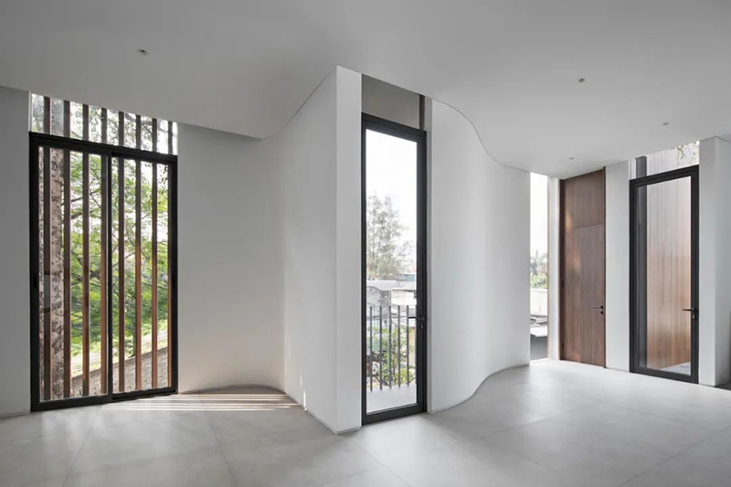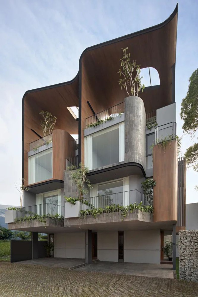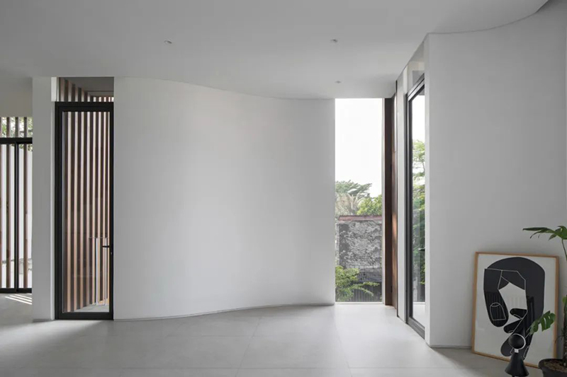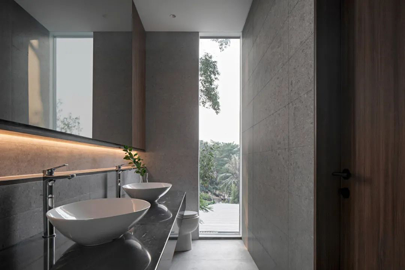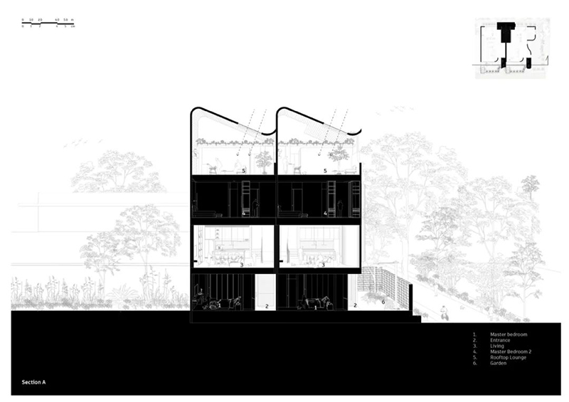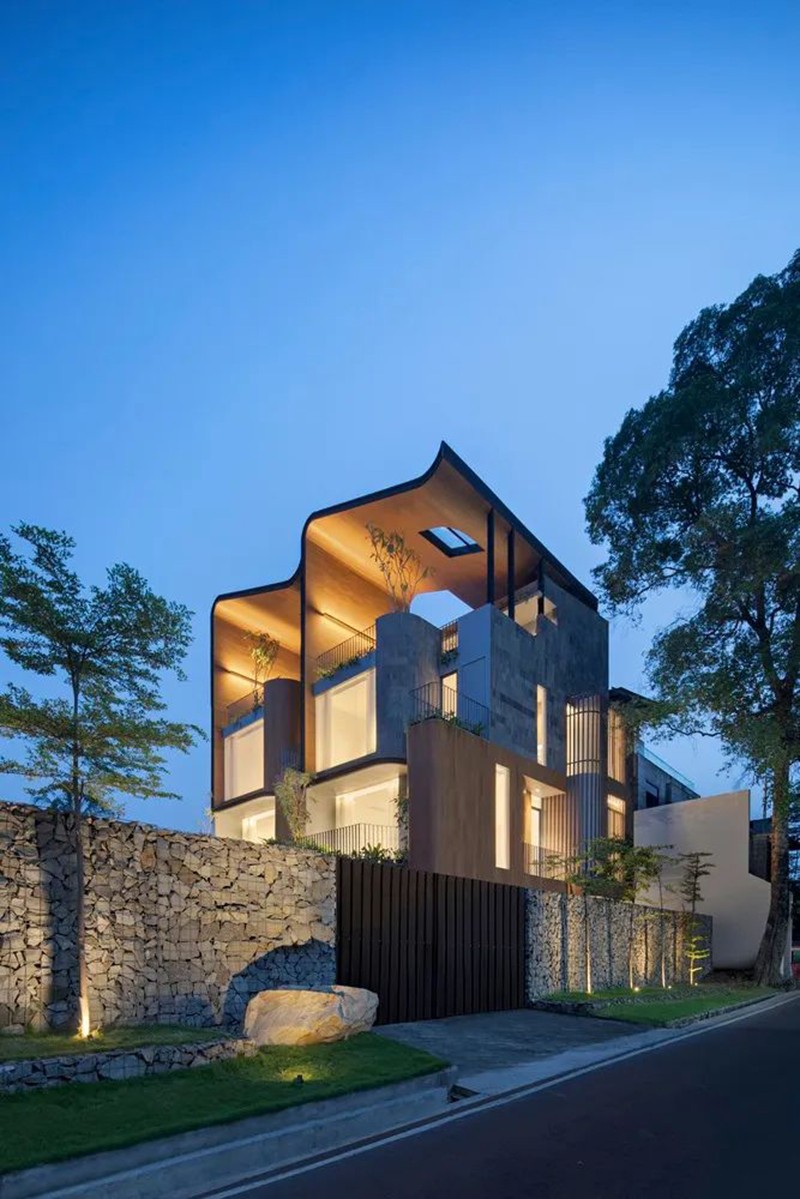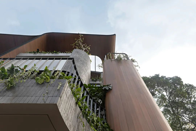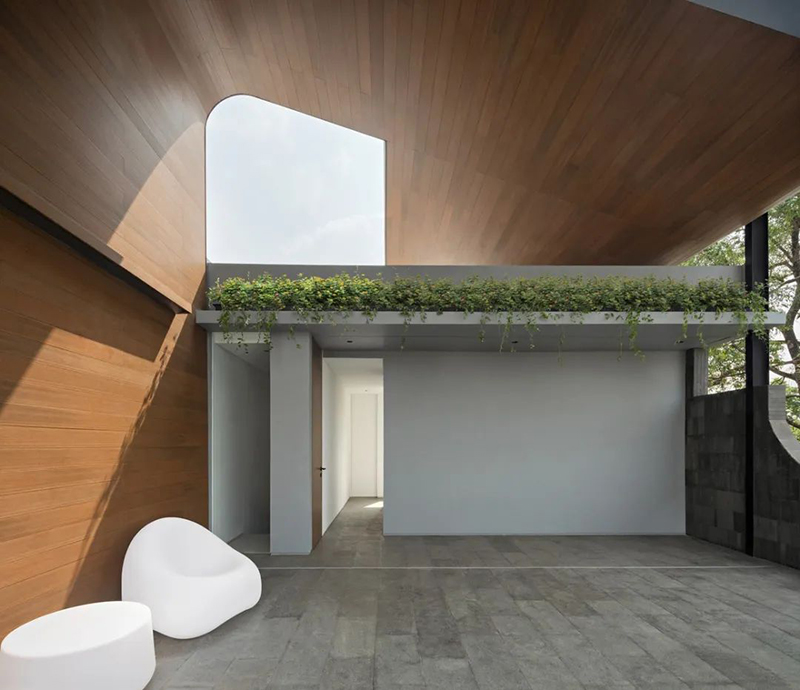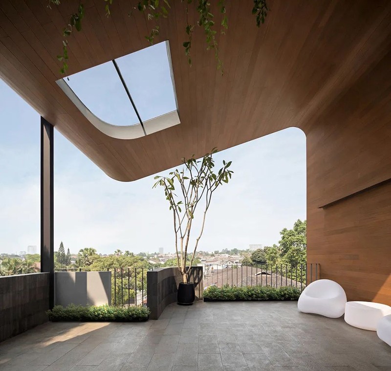 項(xiàng)目打破傳統(tǒng)庭院的平面布局,巧妙地將東南亞住宅常見(jiàn)的“家庭后院”概念垂直延伸至屋頂,使大自然得以在更高處生長(zhǎng),生活也隨之向上拓展。