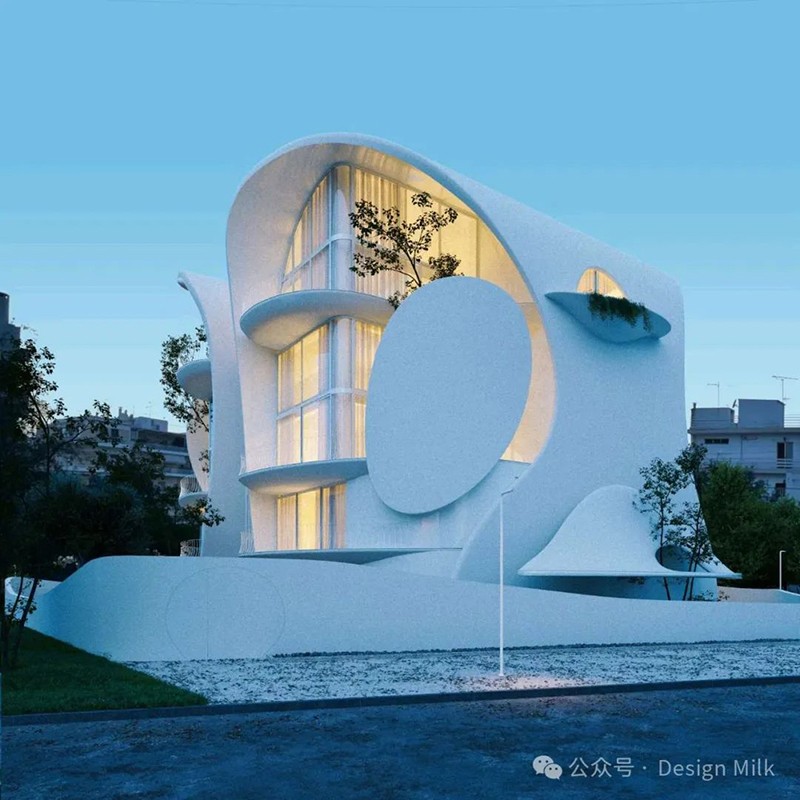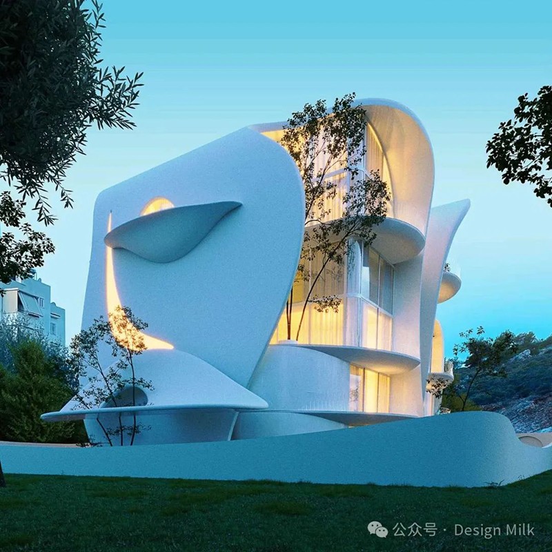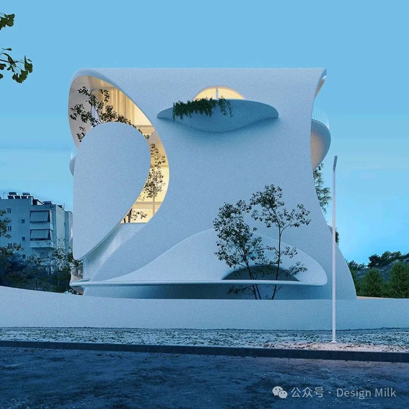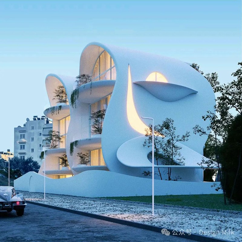 外表面光滑、潔白,加上精心布置的燈光,凸顯了建筑復(fù)雜的輪廓。 設(shè)計(jì)中融入了大型圓形開口和彎曲的陽(yáng)臺(tái),可以看到室內(nèi)景象,并提供與外部無(wú)縫融合的室外空間。 這些陽(yáng)臺(tái)上裝飾著綠色植物,不僅增添了一絲自然氣息,也增強(qiáng)了建筑的有機(jī)美感。 整體效果既具有未來(lái)感又不失自然,營(yíng)造出強(qiáng)烈的視覺(jué)沖擊。