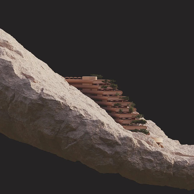 在懸崖之畔,建筑與自然相擁。盤旋的車道似絲帶纏繞山間,錯落的建筑如精巧積木嵌入綠意。車輛靜臥其中,行人悠然漫步,山海為幕,奏響一曲人類巧思與自然壯麗的和諧樂章。